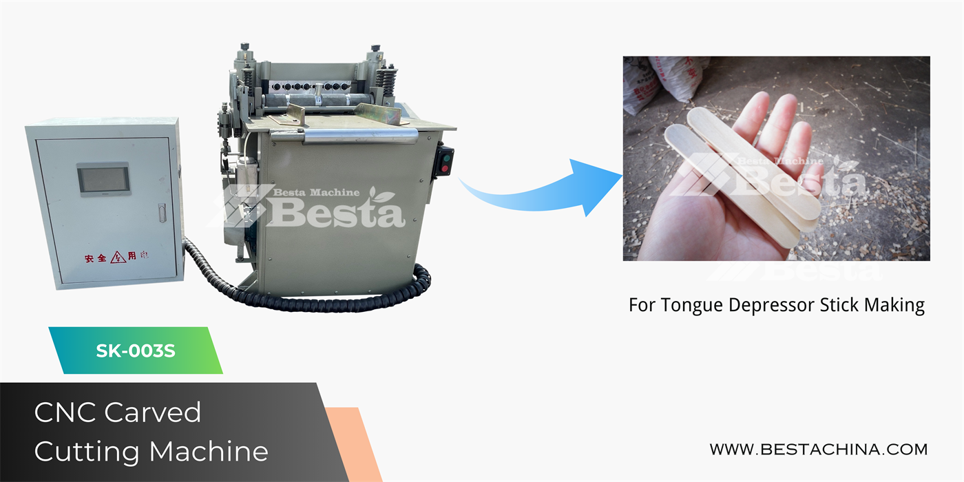 The second key machine for wooden tongue depressor stick making is SK-003S CNC Wooden Tongue Depressor Stick Carved Cutting Machine.